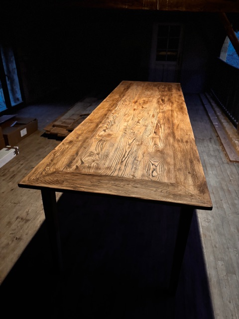 Forma rettangolare con cornice esterna e piano con tavole in verticale. dimensione richiesta del tavolo mt 2,50. Lavorazioni eseguite: stuccatura e piallatura a mano, finiture con cera bio agli agrumi.