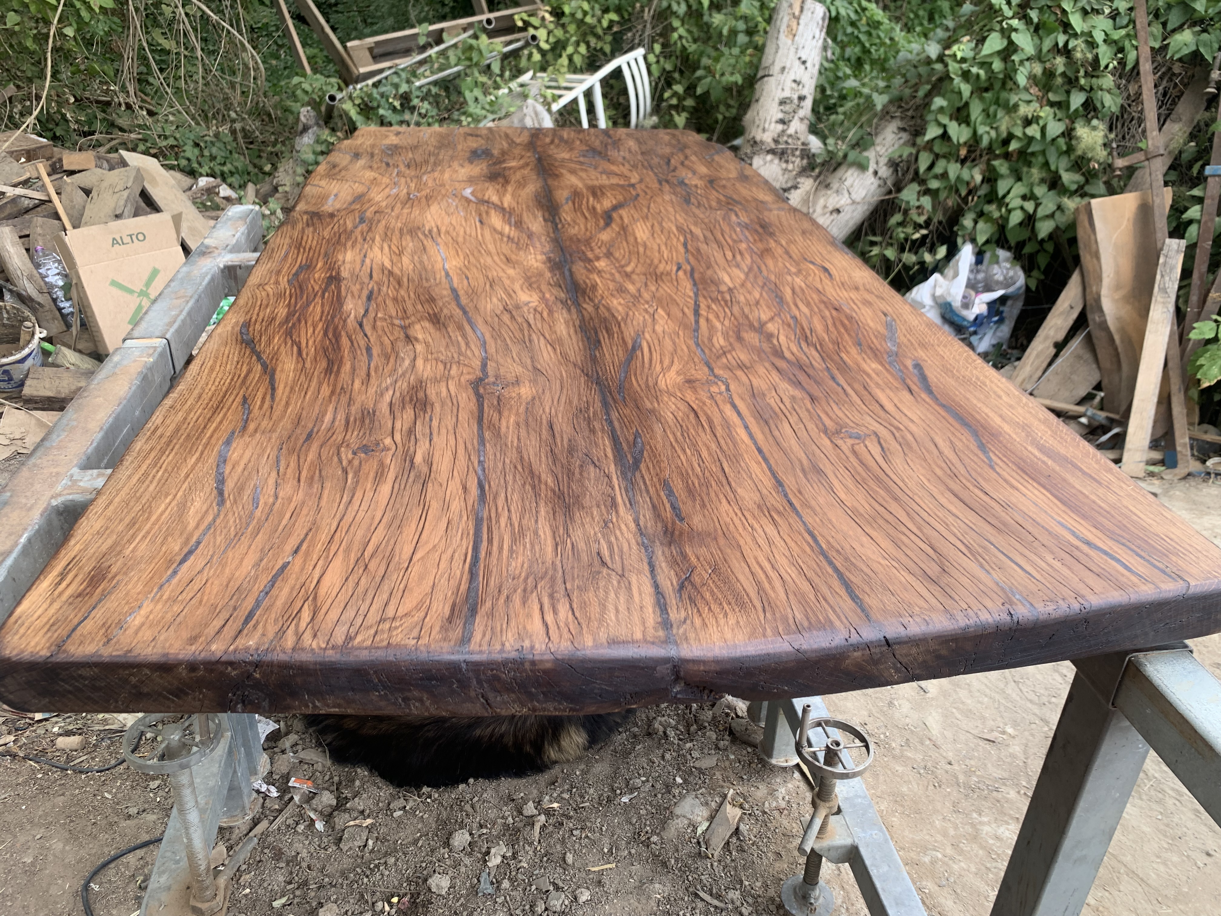 Tavolo in quercia antica massiccia realizzato su misura interamente a mano previo uso di ascia scalpello motosega, struttura portante e…