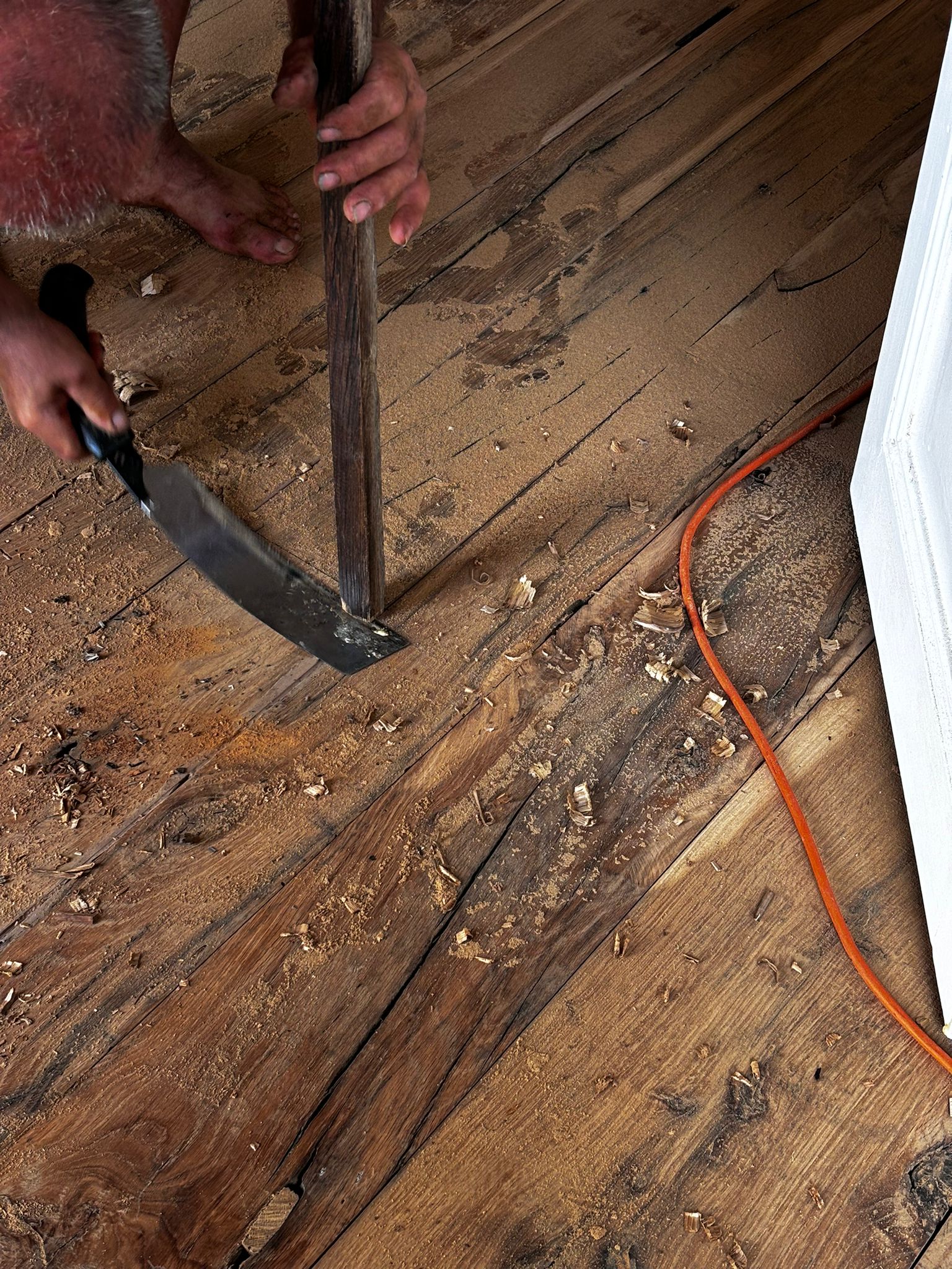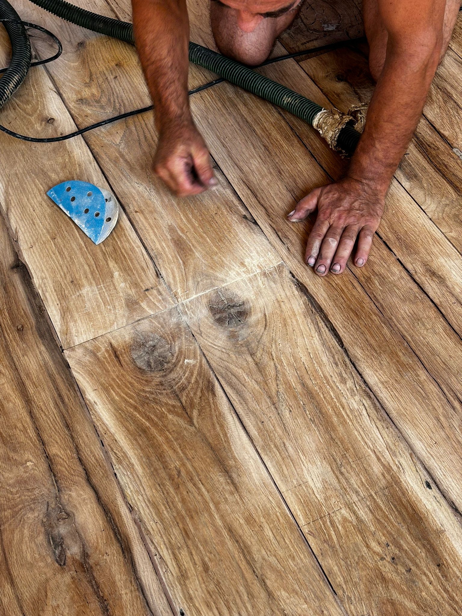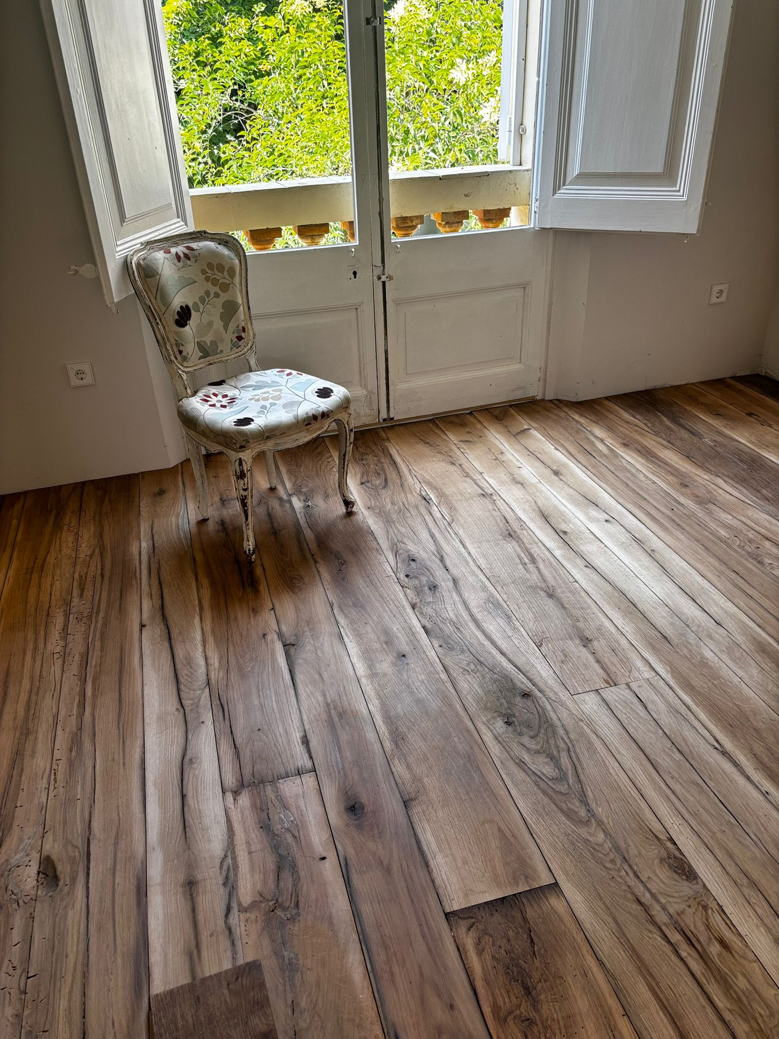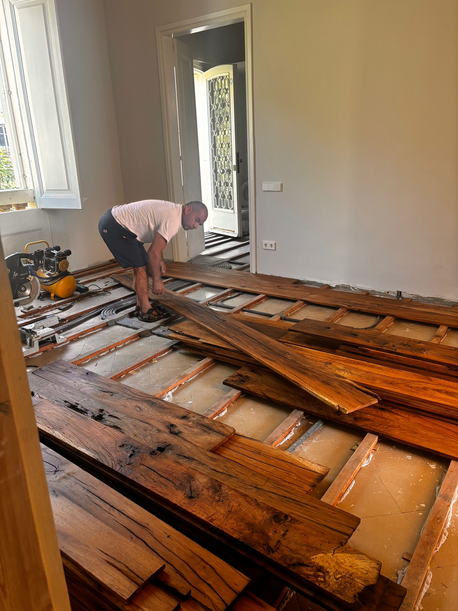 Recuperato all’ interno storico palazzo Francese, portato a spessore richiesto di cm 2 per posa inchiodata sopra Magatelli il legno poggiati ed ancorati sopra pavimento esistente . Sono stati realizzati inserti ad oc usando lo stesso legno della stessa tavola e bisellature trà tavola e tavola , lavorazioni eseguite interamente a mano.