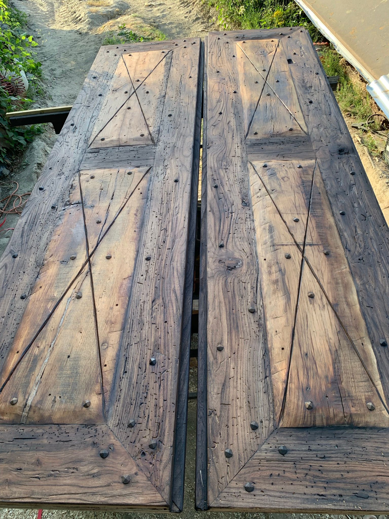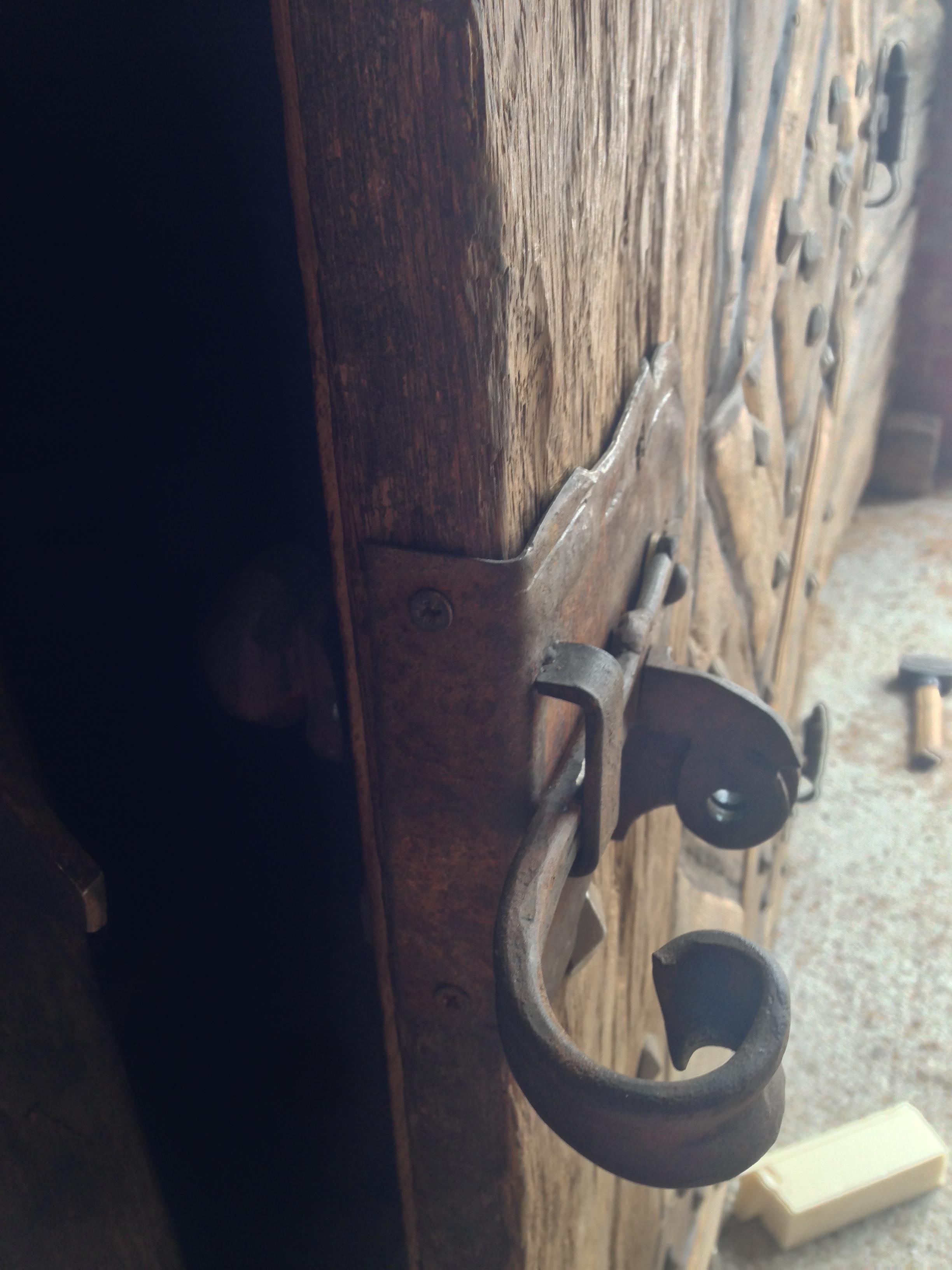 Porta a 2 ante realizzata a misura interamente con accetta scalpello e motosega ha funzione di chiusura parete dispensa cucina per una villa sulle colline Cesenati . Montata su una struttura telaio portante in ferro realizzata su misura dal nostro fabbro . La porta volutamente richiesta intarsiata previo scalpellino nelle bugne centrali ,presenta entrambi i lati in rovere epoca 800 patina vissuta con tavole scelte con 2 diverse cromie. Bugne centrali con sfumature grigio e cornici in marrone tabacco. Chiodi maniglie serrature in ferro forgiato a mano