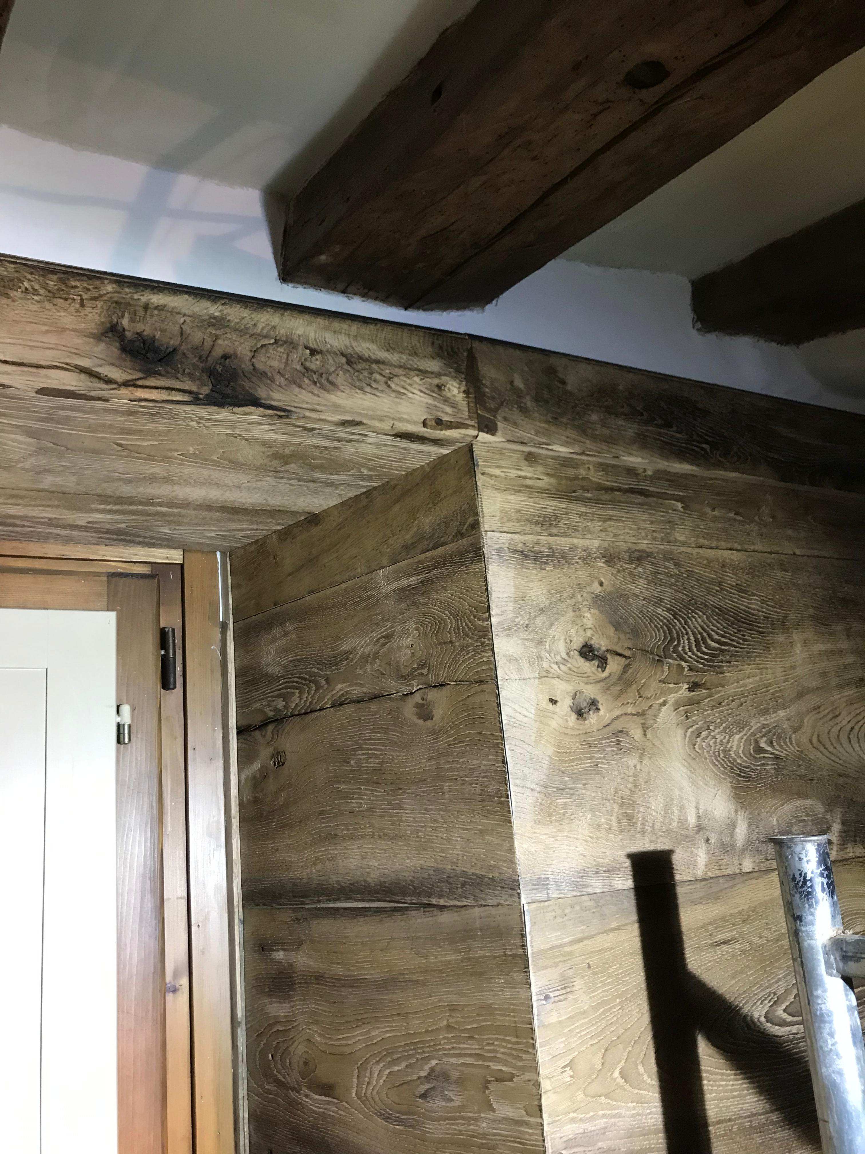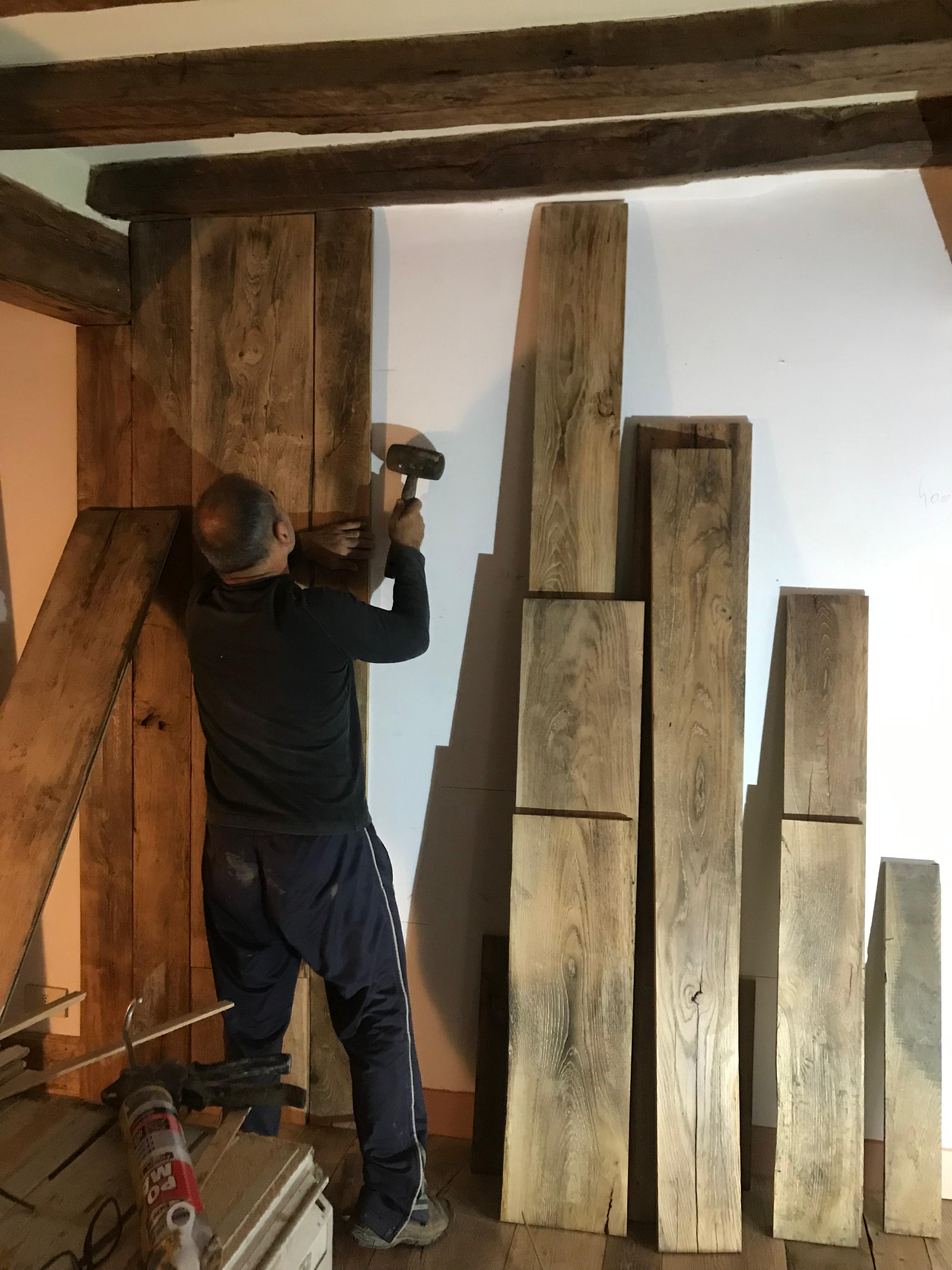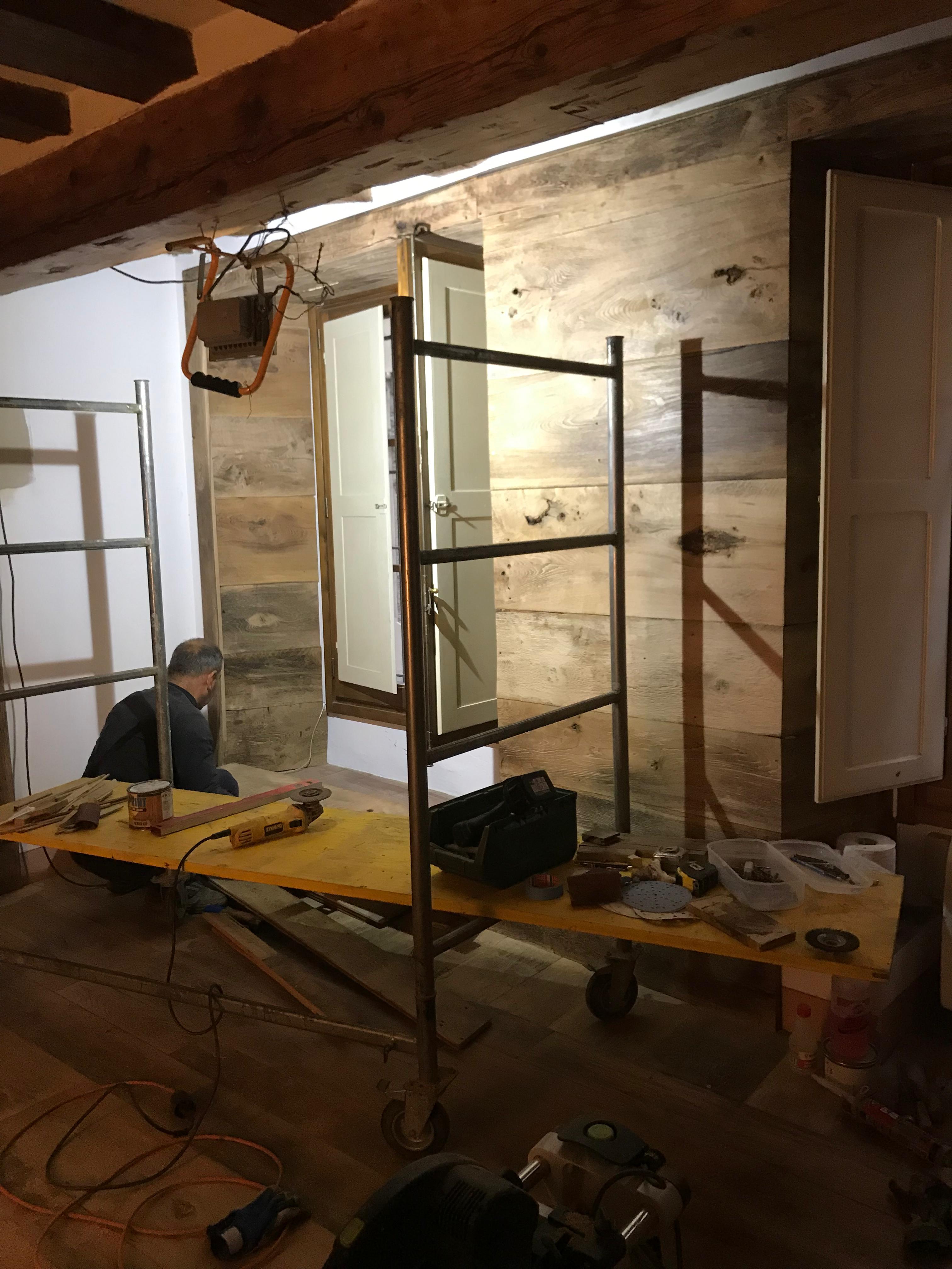 Rivestimento parete in tavole originali antico rovere massiccio. Partita di recupero ottenuta dallo smontaggio vecchio pavimento presso un palazzo nobile epoca 600 in Firenze. Dalla partita abbiamo selezionato le tavole con più carattere estetico quali nodi fessurazioni anelli e fenditure marcate , preferito inoltre cromie calde dal miele al tabacco , proceduto alle lavorazioni tassativamente manuali come schiodo spazzolatura Refilatura e portata a spessore. Sul posto di destinazione , un piccolo ma romantico e grazioso appartamento in un palazzo situato nella via più storica di Firenze . Per conferire un aspetto elegante voluto e richiesto , abbiamo trattato l’ intera partita d’epoca con finiture Velour bio di nostra produzione artigianale ed il risultato ha pienamente soddisfatto il committente ed anche noi