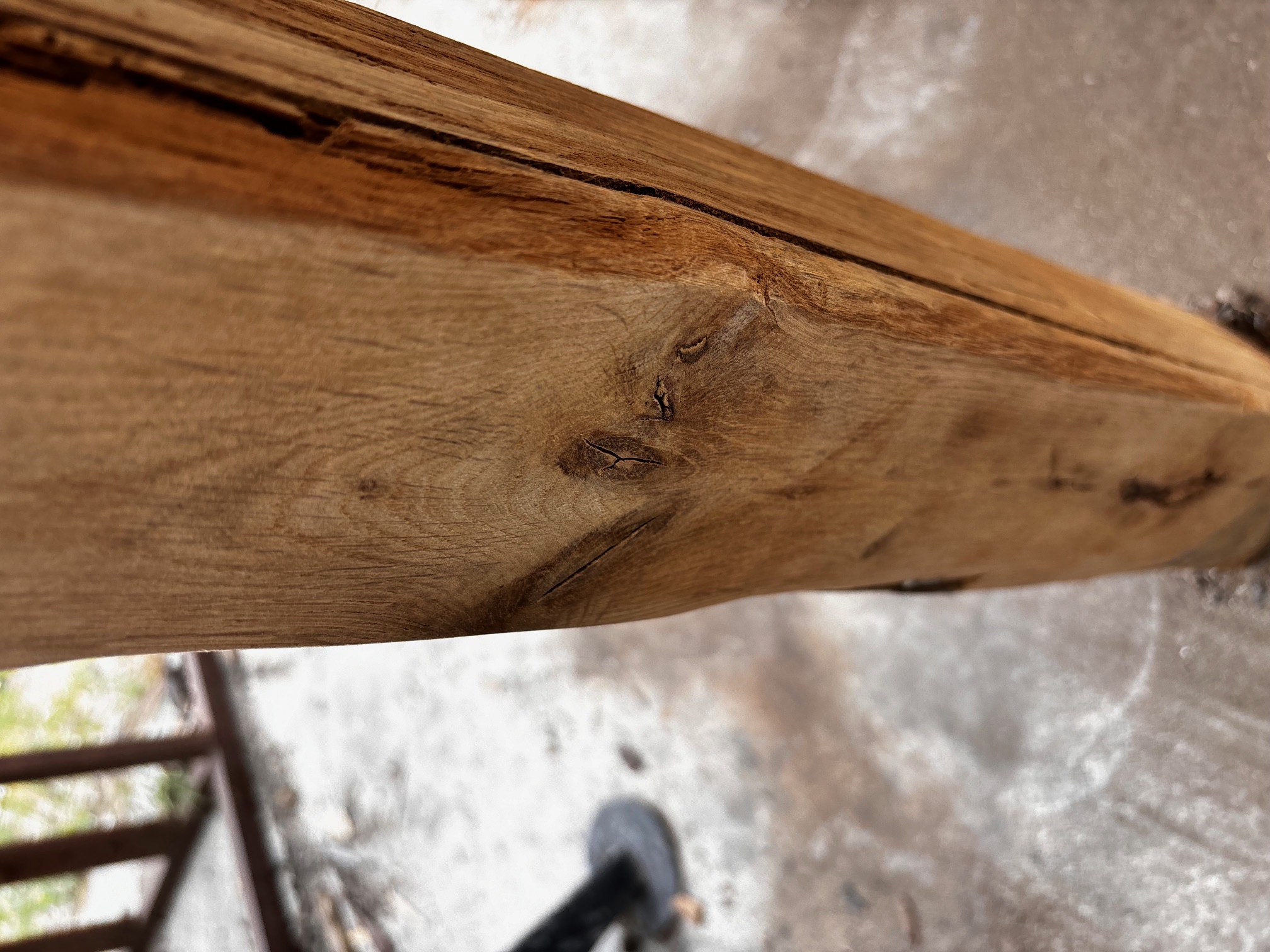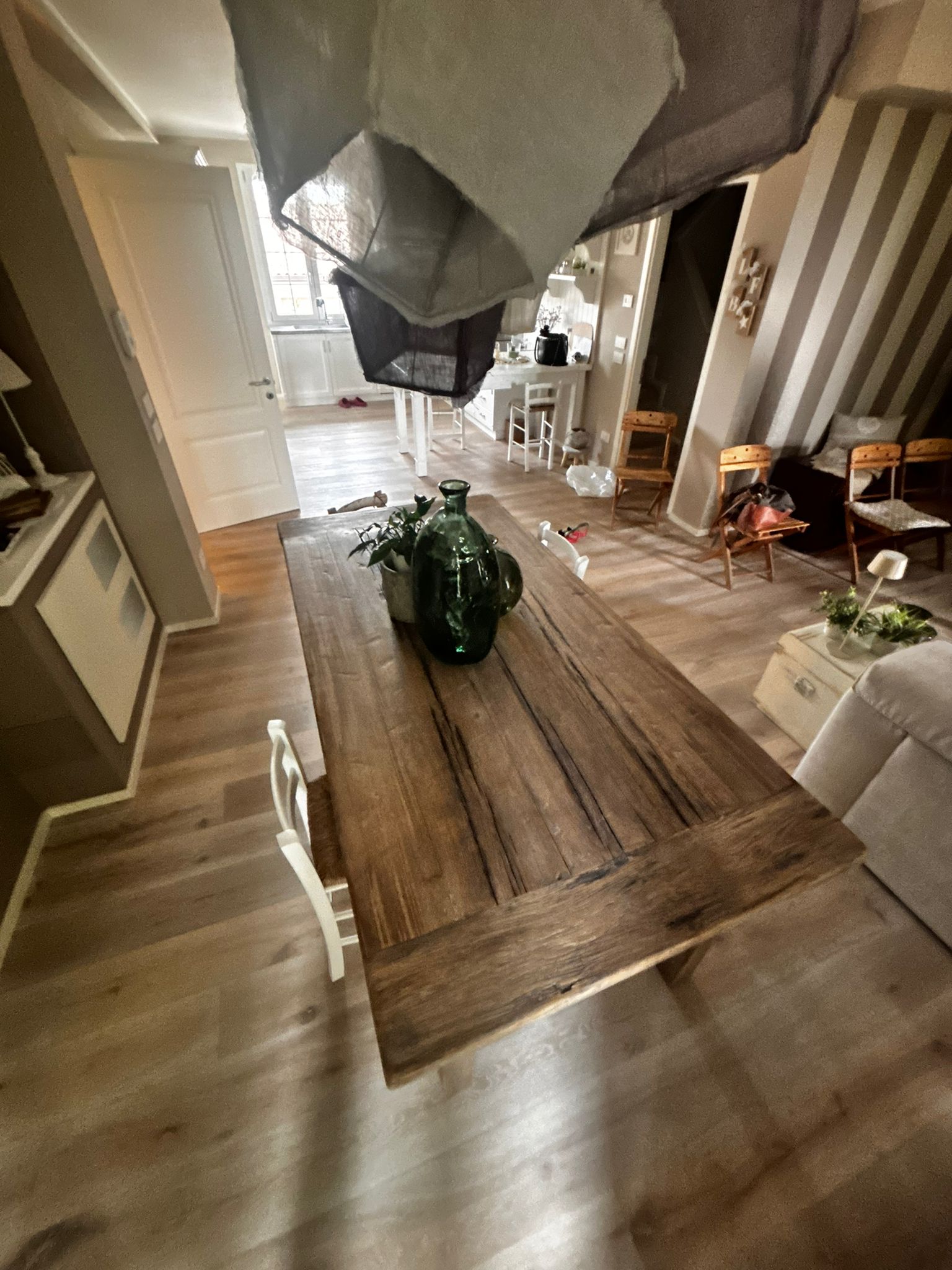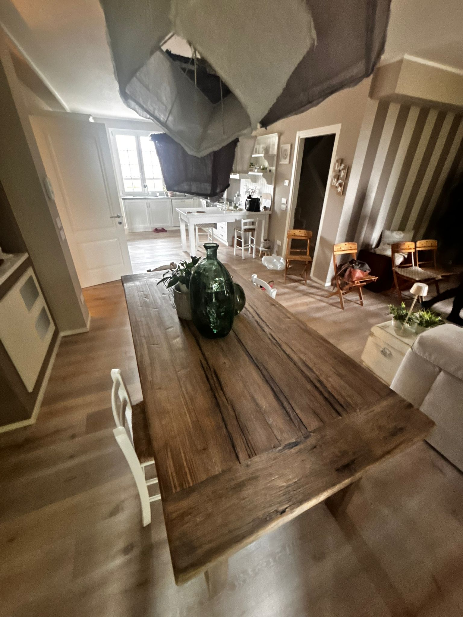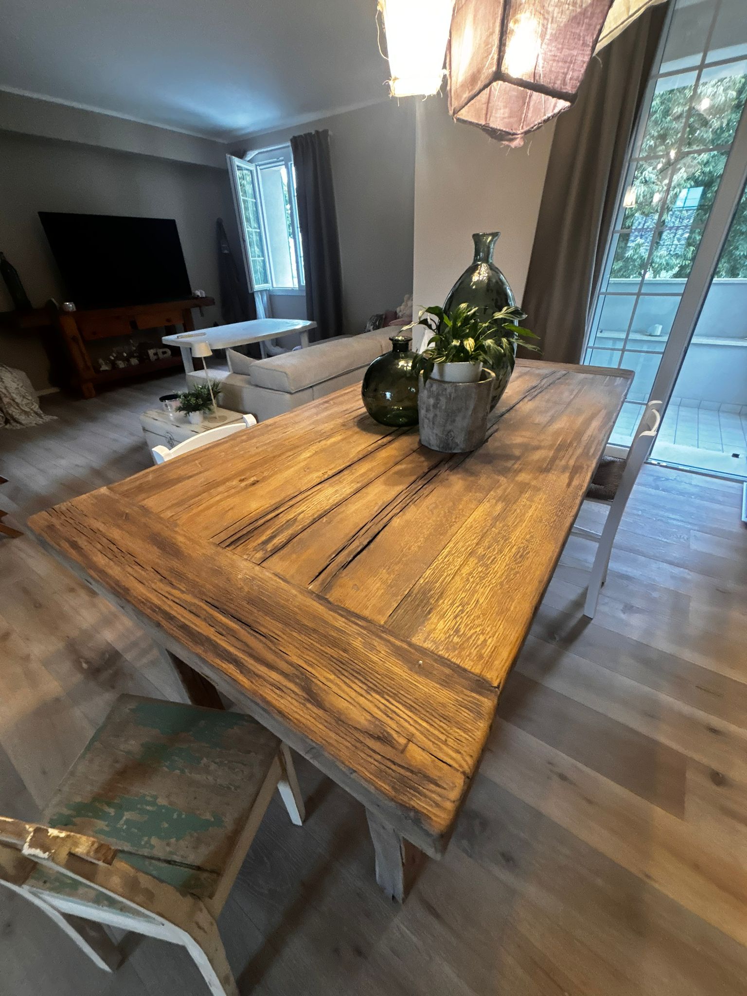 Tavolo in quercia antica massiccia realizzato su misura interamente a mano previo uso di ascia scalpello motosega, struttura portante e piedi tavolo realizzati con doghe storiche di botti recuperate. Mantenuti anche i chiodi in legno originali