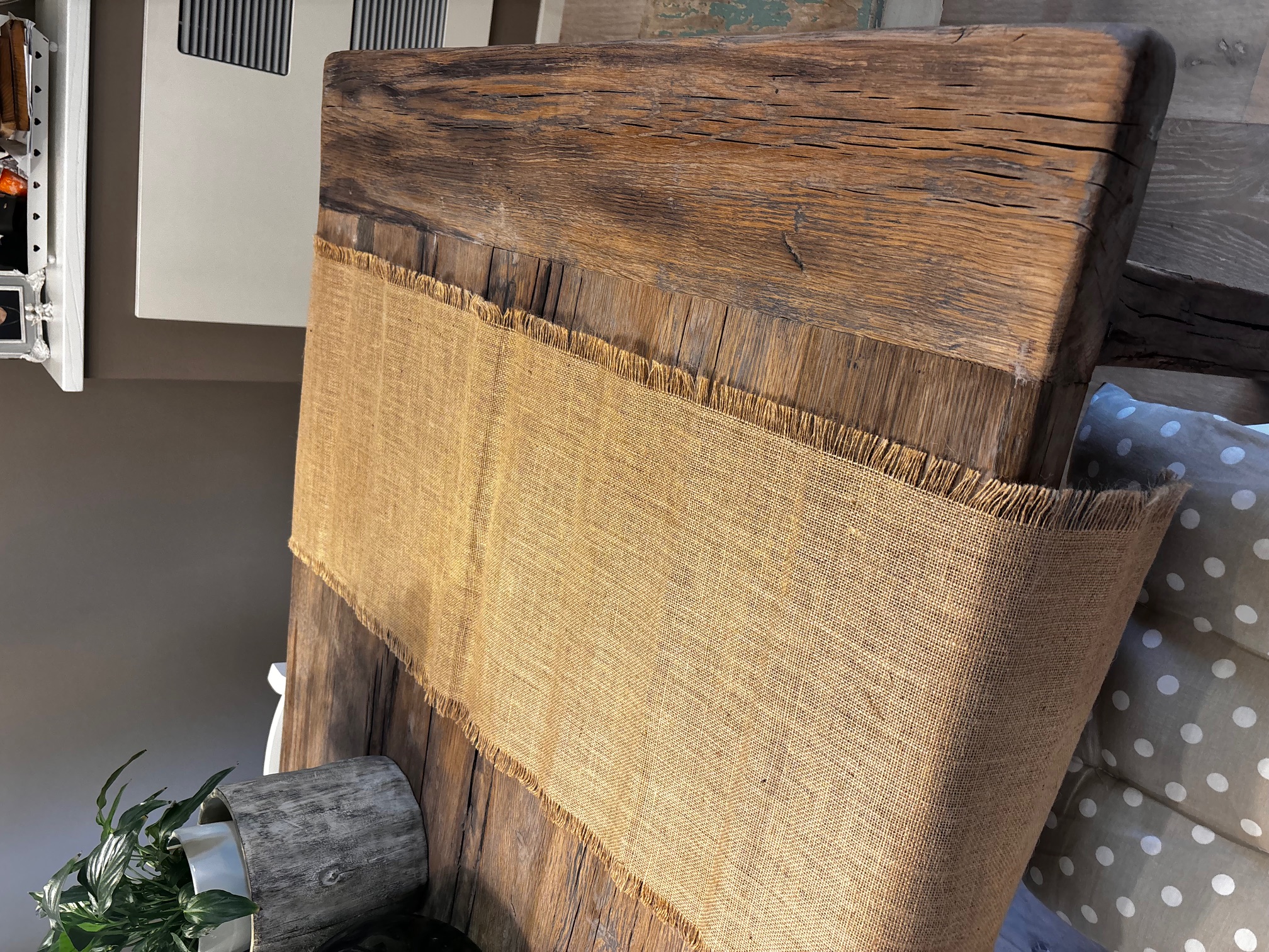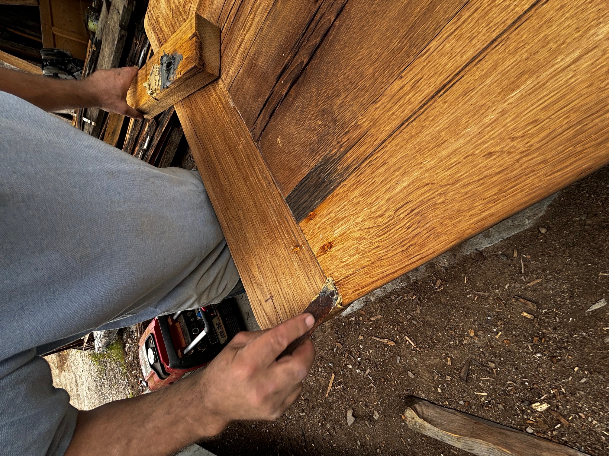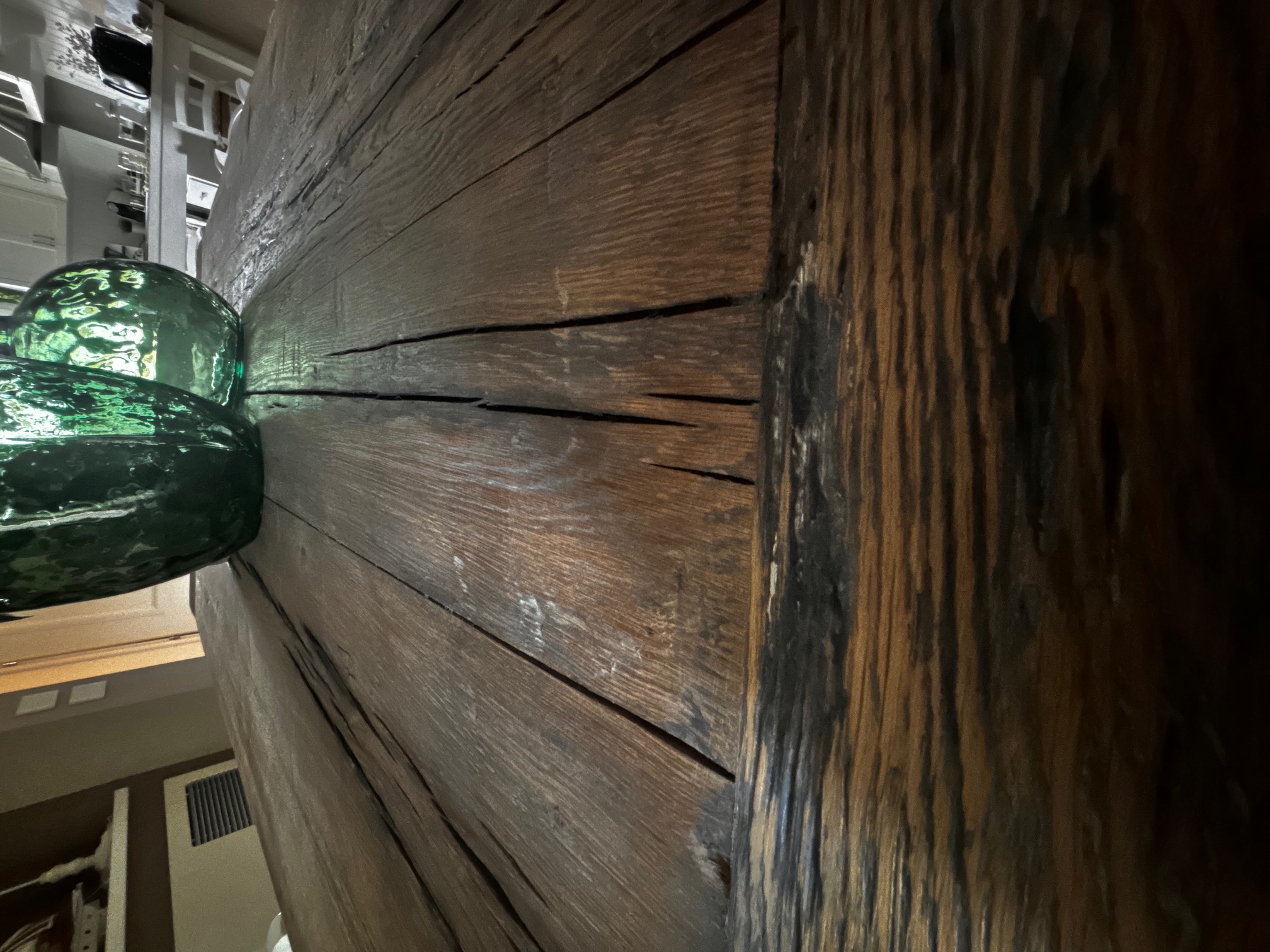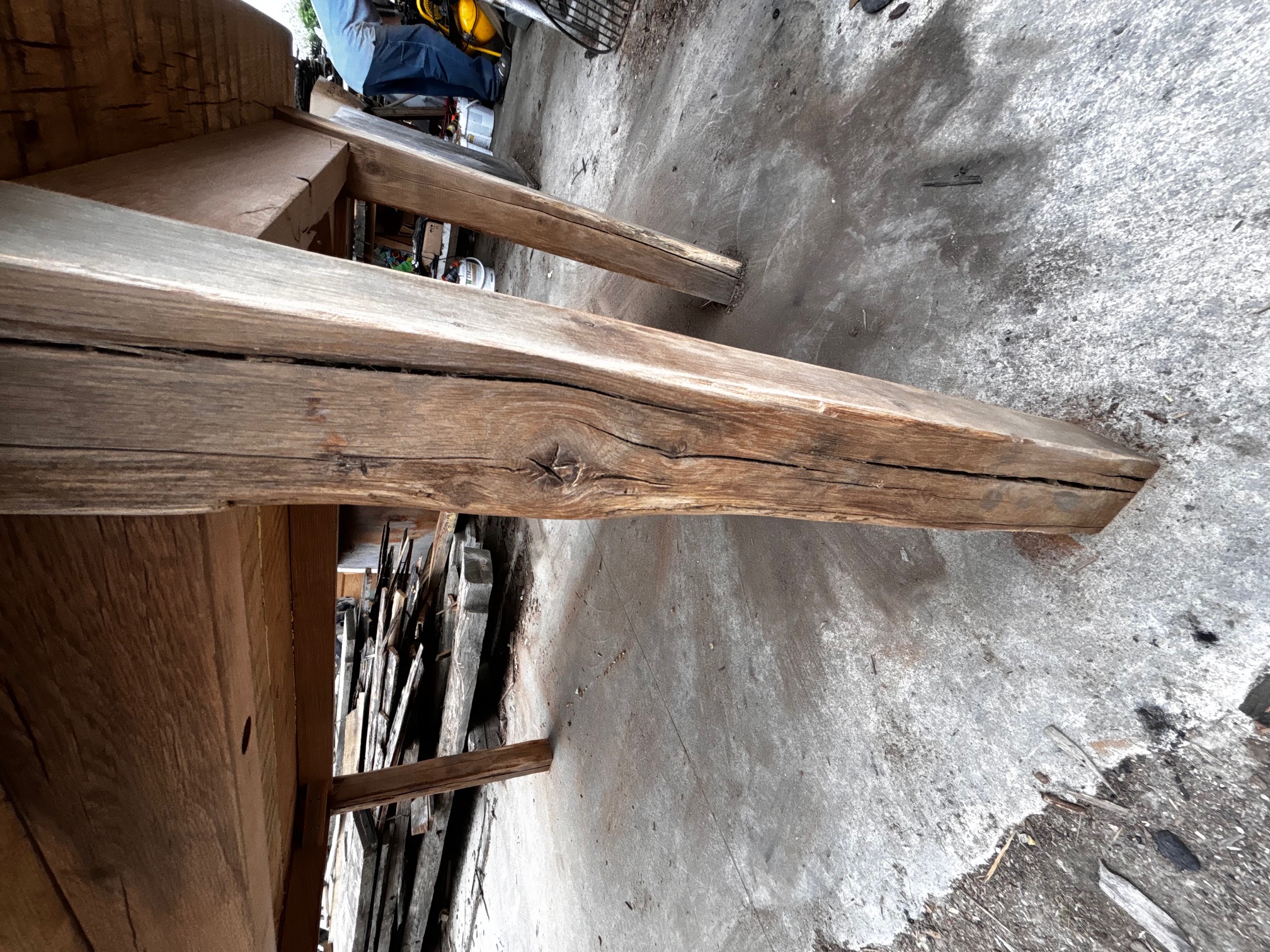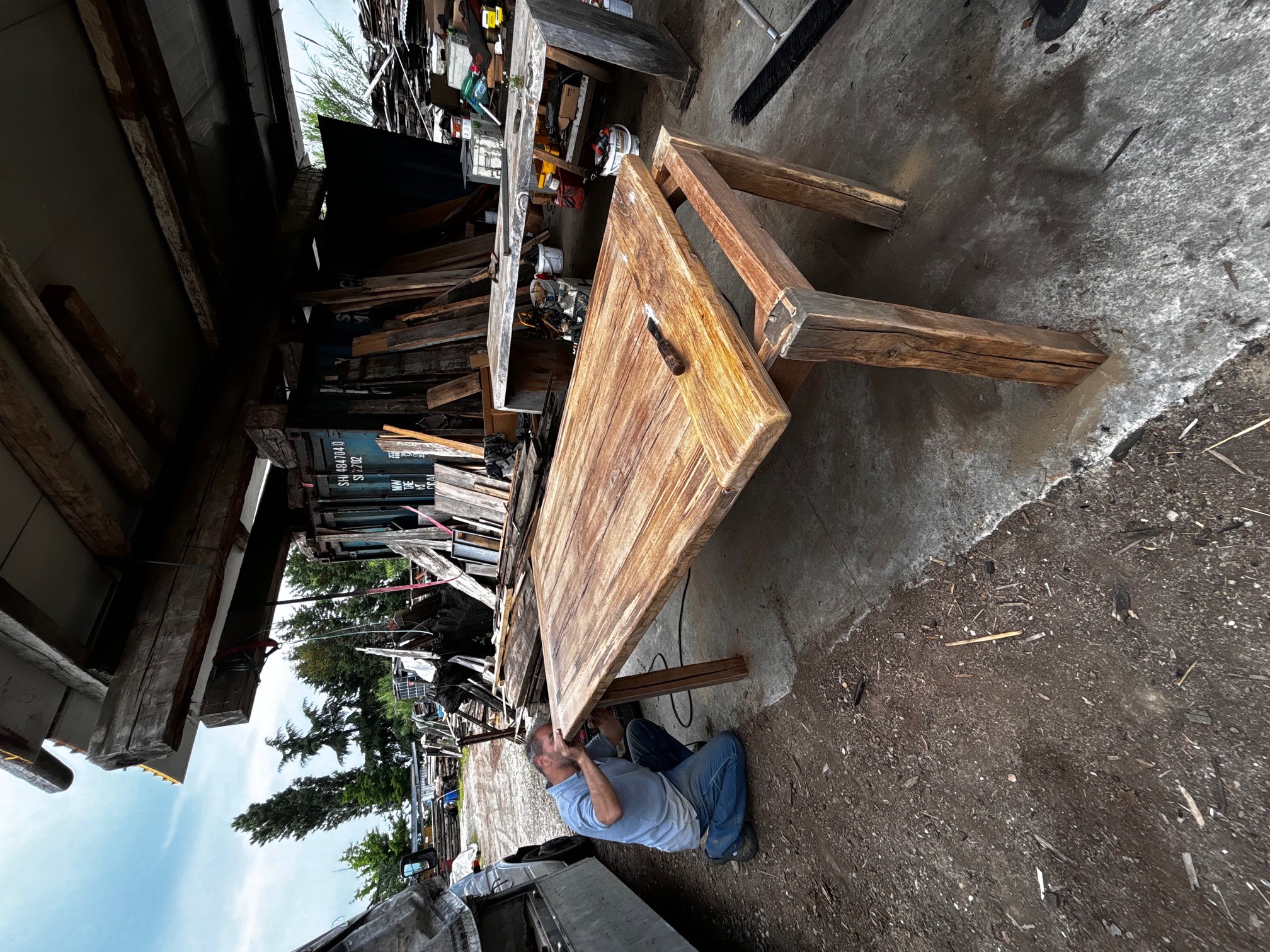 Tavolo in quercia antica massiccia realizzato su misura interamente a mano previo uso di ascia scalpello motosega, struttura portante e piedi tavolo realizzati con doghe storiche di botti recuperate. Mantenuti anche i chiodi in legno originali