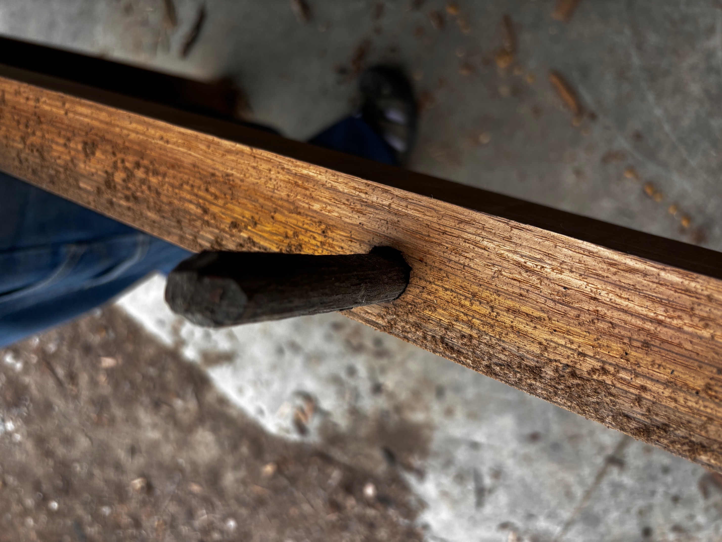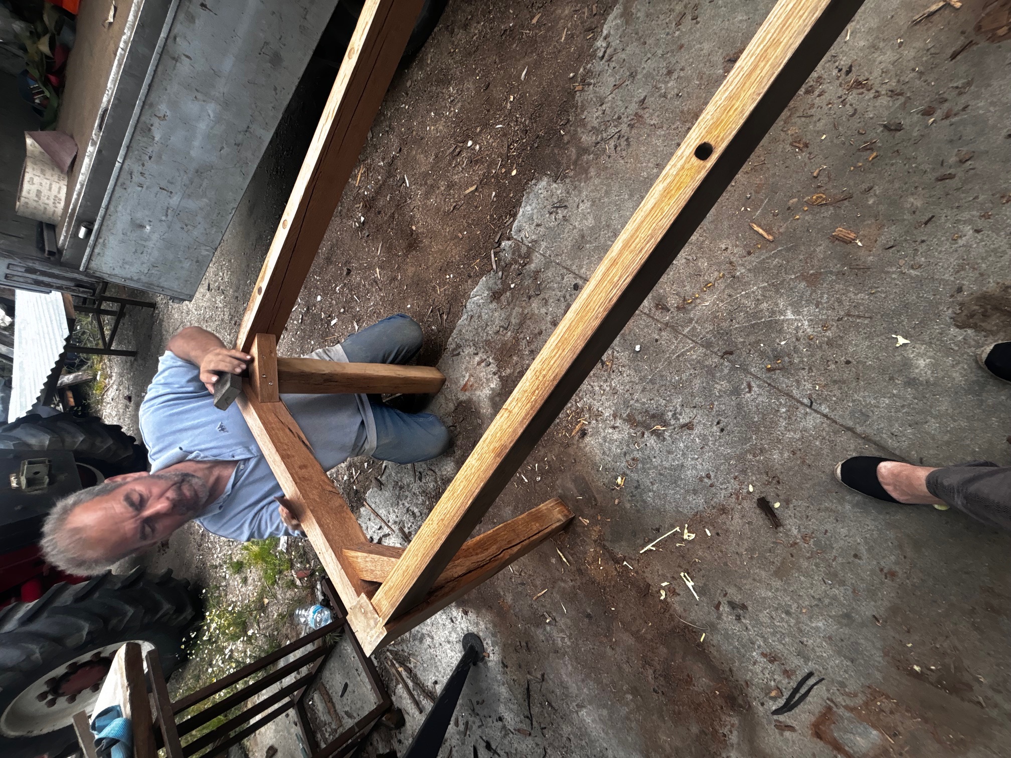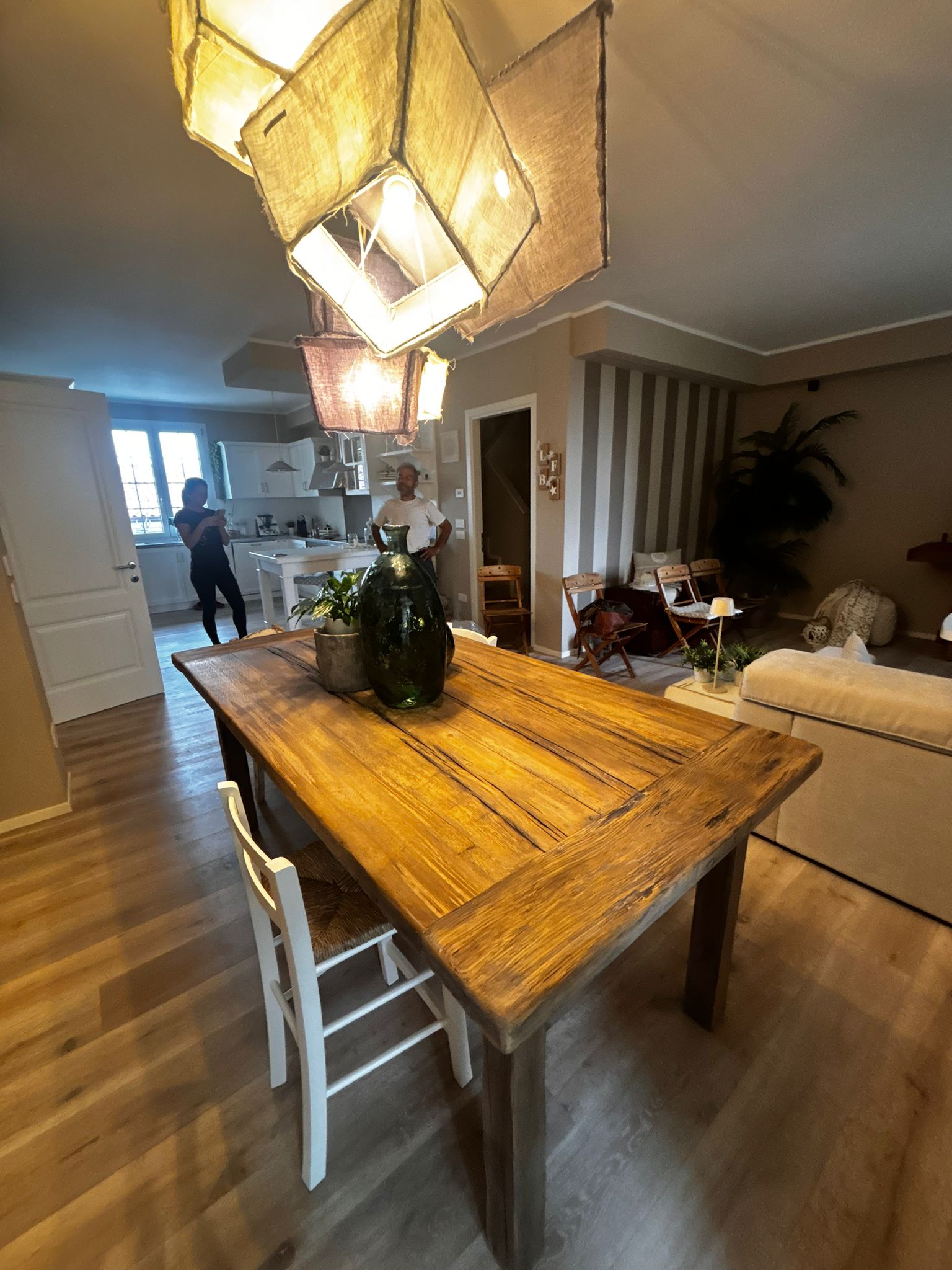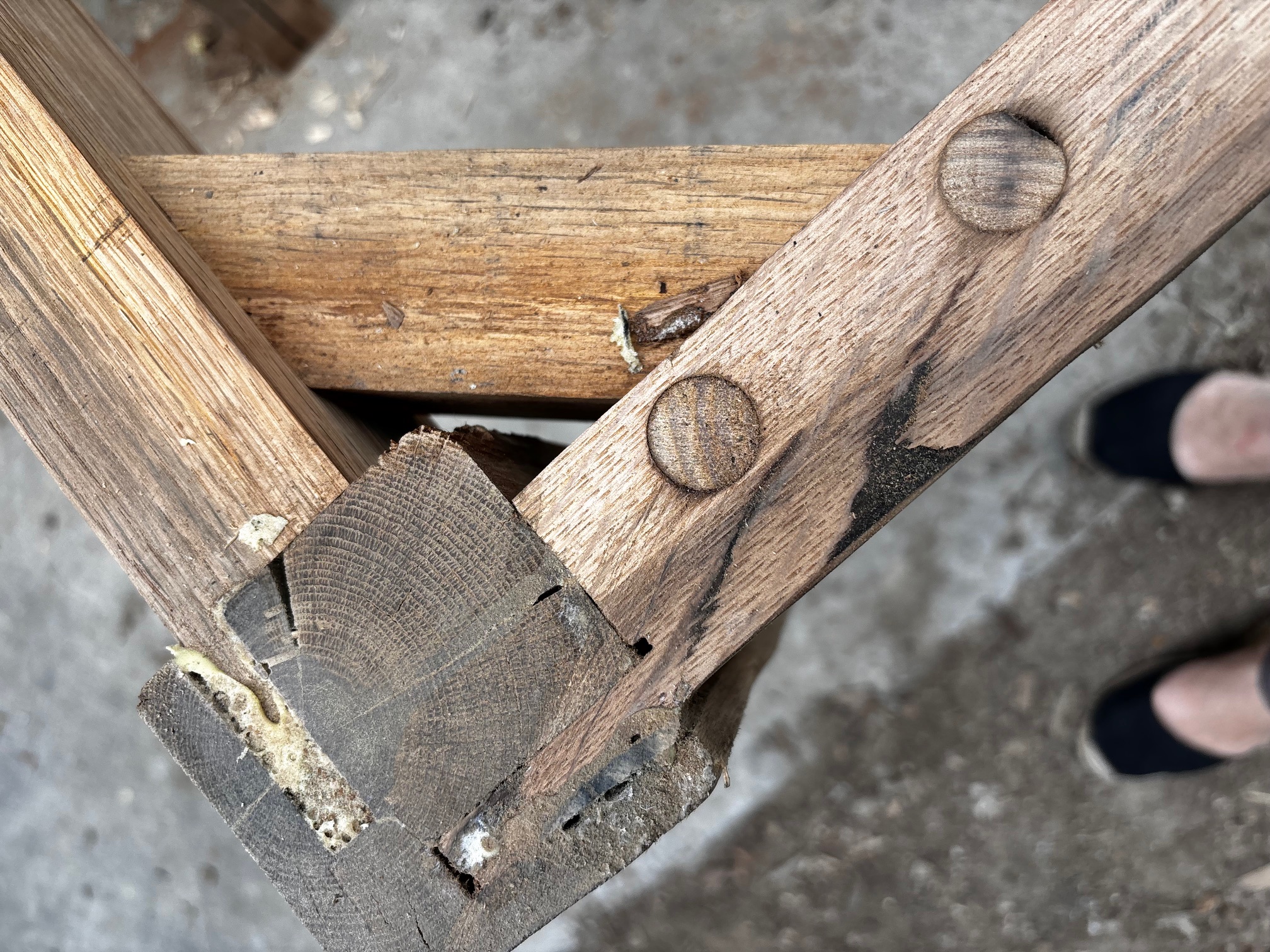 Tavolo in quercia antica massiccia realizzato su misura interamente a mano previo uso di ascia scalpello motosega, struttura portante e piedi tavolo realizzati con doghe storiche di botti recuperate. Mantenuti anche i chiodi in legno originali
